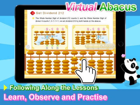 Built-in virtual abacus enables you to follow the lessons and practice the Two Hands Fingering Method on the abacus at the same time. You can try to solve the examples on the virtual abacus by yourself and check with the demonstration steps provided on the page as well.