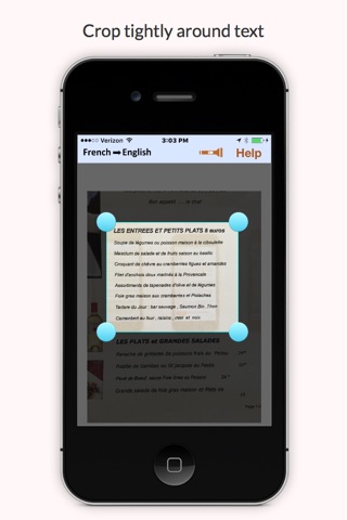 Order easily from a French-language menu. Take a photo, crop as needed, and hit "Translate." Thats it! Each line of English is in bold text immediately below the line of French, so you can point to your choice.