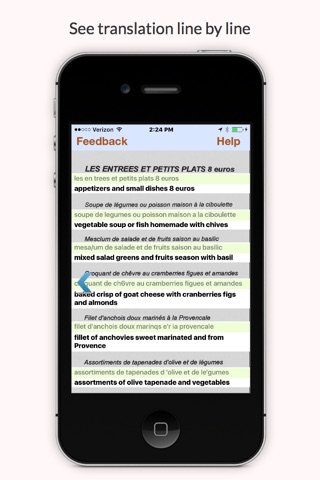 - It is not just a word translator. Each line of the menu is followed by its translation, so when you find what you want to order you can point to it on the menu.