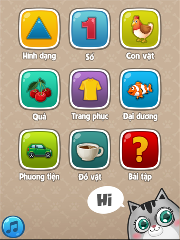 Game Mèo Bon đi học cho bé khả năng học và tìm hiểu, nhận biết được hình dạng, con số, động vật, hoa quả, phương tiện, đồ đạc …. thông qua các hình ảnh ngộ nghĩnh.
