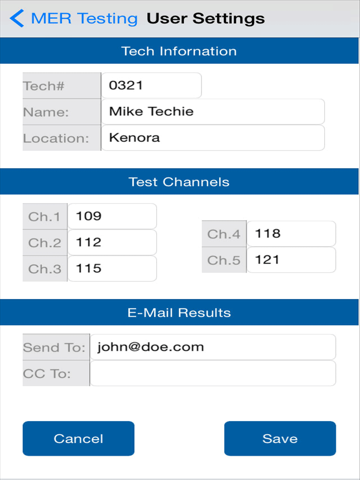 Settings screen allows you to set up your Tech Number, Name, Location and 5 Test Channels, as well as an email address to send the results in PDF format.