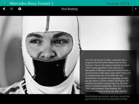 No other team dominated the 2014 Formula One season like Mercedes-Benz. Lewis Hamilton and Nico Rosberg, both of Mercedes-Benz, competed down to the wire for the championship, providing plenty of entertainment during each race, before Hamilton ultimately took the crown. This new app gathers and enhances the contents of the Mercedes-Benz Book, 2014 - Turning Silver into Gold, which re-lives the season with stunning images. Activate the interactive features of the app by scanning tagged pictures, and discover exciting bonus material such as videos and interviews. The result is a unique portrait of motorsports passion. This app comprehensively brings together the history of the Silver Arrows and highlights from the 2014 season.
