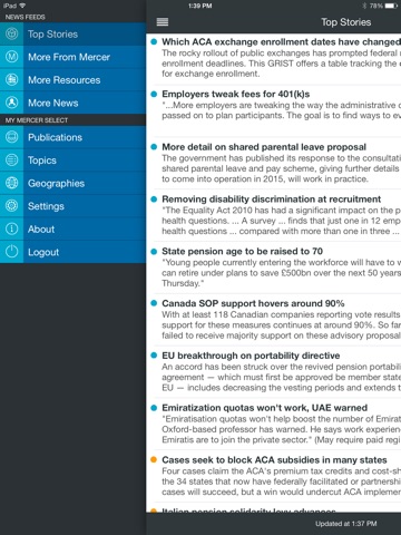 Mercer Select is an information service for individual and organization members interested in news, views and analysis on a broad spectrum of benefit, compensation and HR issues around the world. This app allows Mercer Select members to access, on the basis of their memberships and user-chosen topics and geographies, the content from Mercer, newspapers, and magazines, journals and other resources they are able to access via the Mercer Select website and emails. Members should log into the app using their regular Mercer Select usernames and passwords. The app also allows Mercer Select members to save and access preferred content while offline. We are currently developing article sharing/emailing and customized alert enhancements.