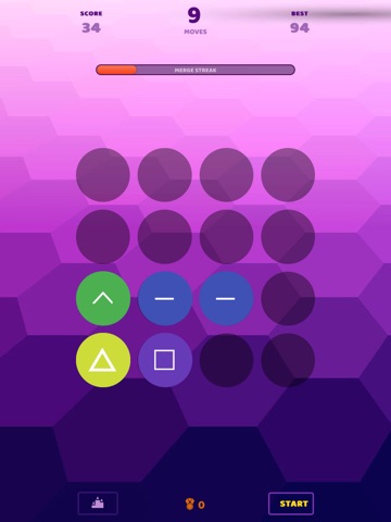 When two tiles with the same shape or colour merge, they make a different shape! The more the number or lines in the shape you make the more your points. Merge 10 tiles in a row - horizontally, vertically, or both - to grab a bonus move and unlock the power mode!