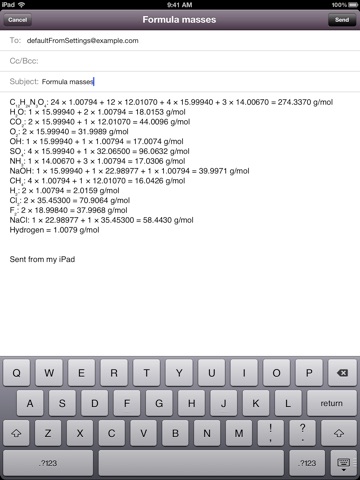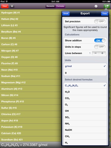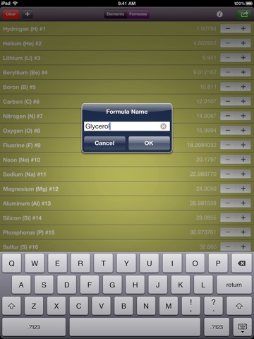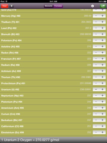 Using the calculator, type a formula or tap in the counts of elements to build the molecule. Save the molecule to keep it around and see composition and per-molecule weight.