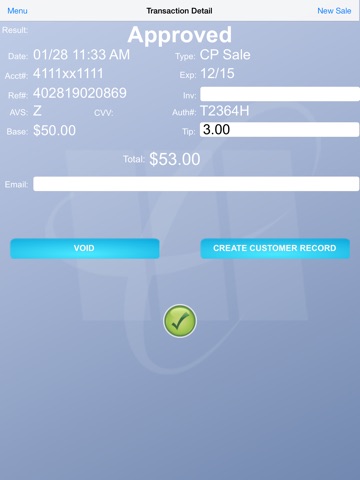 - Transaction types include card present sale, mail/phone order, refund, and void.