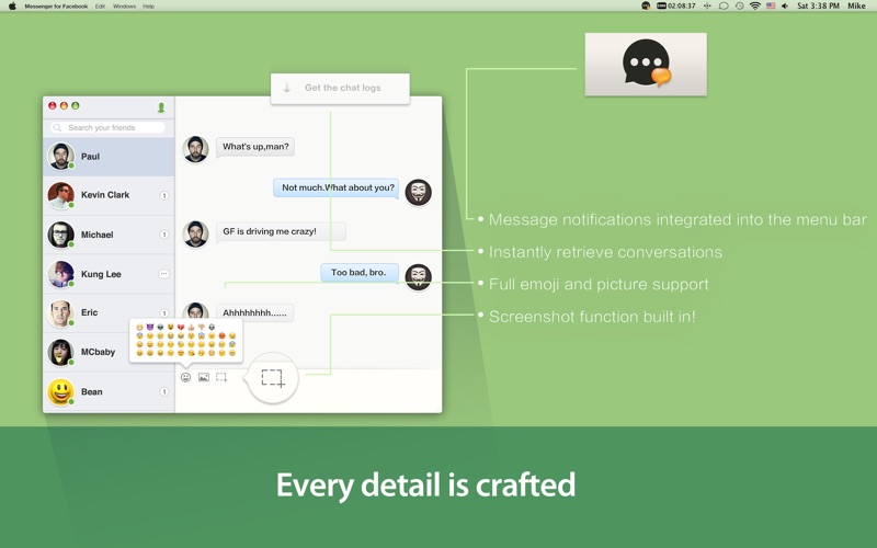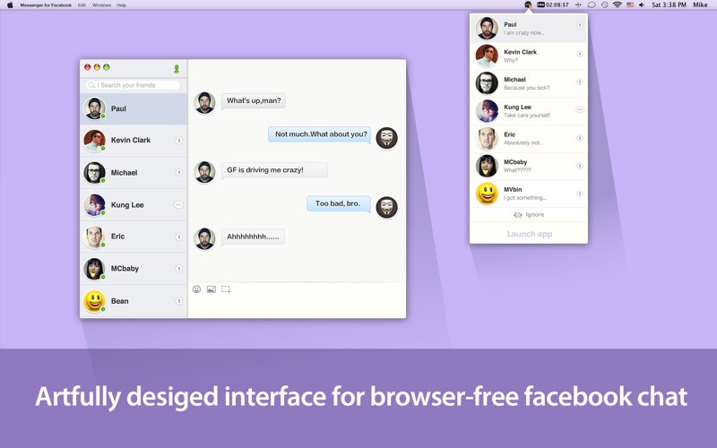 Nice application, and nice design, but please add some features : -groups conversations -most recent conversations/contacts in the side panel, like on the facebook site -application not visible in the dock but always in the top bar -...