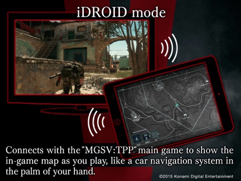 Linking your app to the main game allows yo to navigate the world of METAL GEAR SOLID V by using the iDROID as a navigational system and support terminal for calling support helicopters.