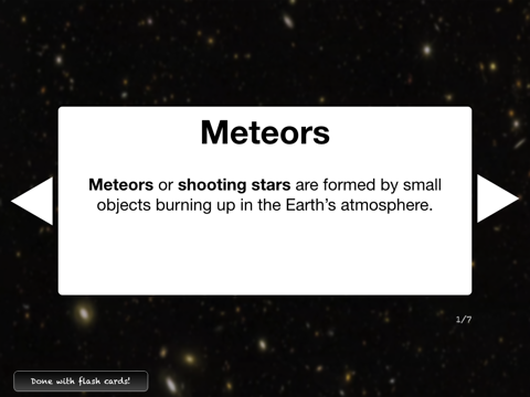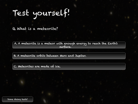Ideal for classroom or individual learning, this app will teach you the basics of Meteors and Meteorites - the extra-terrestrial rocks that occasionally hit the Earth.