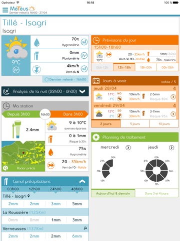 The Meteus application allows you to access the weather data of the stations of all members of the Meteus network, close to your home and everywhere in France. You thus have, without moving, the real weather conditions of your fields at 10, 20 or 30 km from your home ! This way you can easily compare the weather conditions of your favourite stations and optimize the organization of your work sites.