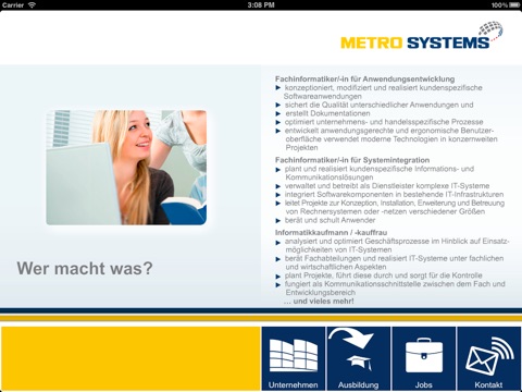 Die App führt Sie in die Welt der METRO SYSTEMS ein und zeigt auf, was es bedeutet, innovative IT-Lösungen für einen internationalen Handelskonzern zu entwickeln.