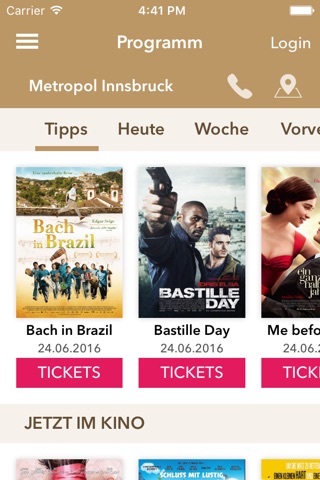 Bleib immer up-to-date und lass Dich über neue Filmstarts, Kino-Premieren, Trailer, Events und Sneak Previews informieren. Alle aktuellten Vergünstigungen und Vorteile landen direkt auf Deinem iPhone. Kinoprogramm und Vorführungen immer aktuell und filterbar nach 2D, 3D, Real3D, Atmos, IMAX, IMAX 3D, in OV und OV 3D. Ebenso verfügbar: alle Spieldaten der Ballett- und Opern-Übertragungen aus der Royal Opera London und der Metropolitan Opera New York.