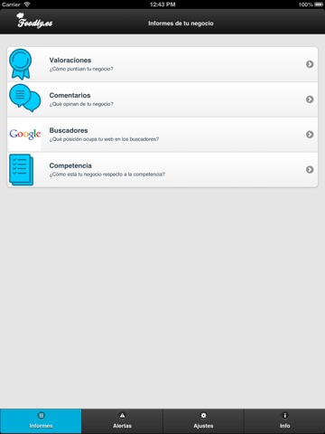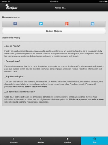 El gestor de opiniones y presencia on-line de tu restaurante. Foodly es una herramienta de reputación online muy sencilla que te permite llevar un control exhaustivo de la reputación de tu restaurante y de tu competencia en Internet. Gracias a su potente motor de búsqueda, cada día podrás descubrir las valoraciones y opiniones de tus clientes, así como tu posicionamiento en Internet. Con esta App podrás estar al día de todo lo que se dice de tu restaurante en cualquier momento y desde cualquier lugar.