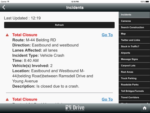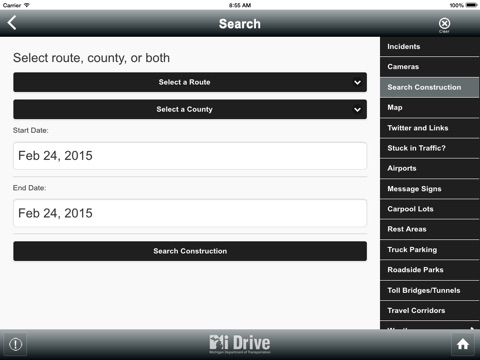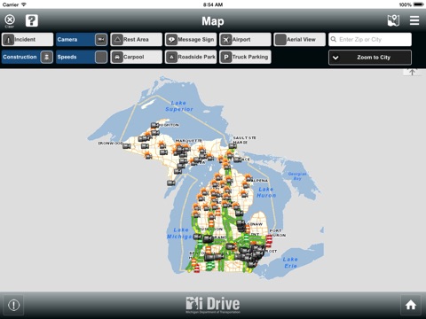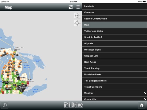 Use this handy Mi Drive app to check real-time road and traffic information about Michigan (M), Interstate (I) and US routes across the state before getting behind the wheel. Its brought to you by the Michigan Department of Transportation (MDOT).