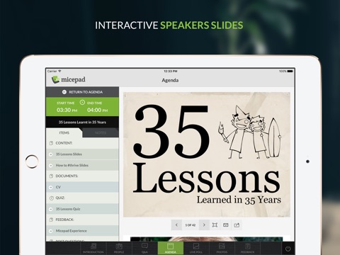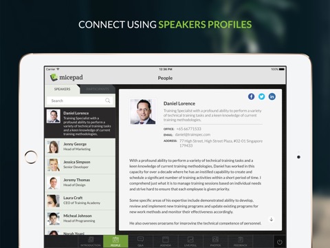 The Micepad app allows you to have all your event’s information at your finger tips, such as Event Agenda, Speaker’s Slides, Bio Profiles and crucial must-have information.