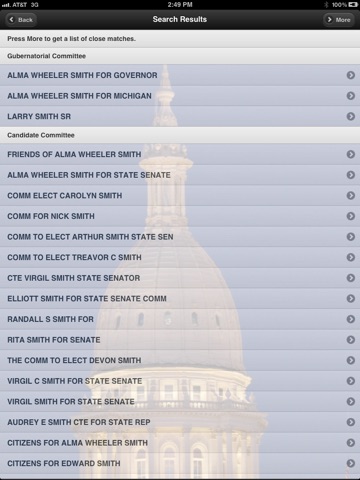 Michigan CFS (Campaign Finance Search) provides real-time access to the latest Michigan state campaign finance information, viewed as aggregated totals. The application provides mobile access to electronically filed campaign finance information for all state offices, state political committees and quick access to direct cash contributor information, on the go. It allows you to enter name-based exact or close match searches that provide a listing of candidates and/or committees that meet the search criteria.