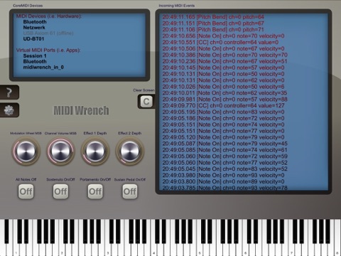 The Swiss army knife for your daily MIDI setup tasks. Connect a MIDI keyboard, MIDI sound expander or any other MIDI device to your iPad, iPhone or iPod touch by using the Apple USB camera adapter or any other adapter supported by Apple. Visualize and monitor MIDI messages sent by the connected MIDI device or send MIDI messages to those connected MIDI devices. This is a simple but helpful tool to find problems in your MIDI setup or simply to spot what kind of messages various MIDI devices are sending exactly.