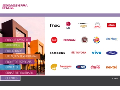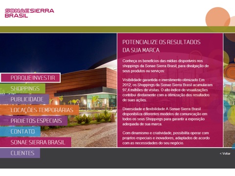 A Sonae Sierra Brasil disponibiliza este aplicativo para apresentar as opções de mídia e locações temporárias em seus shoppings.