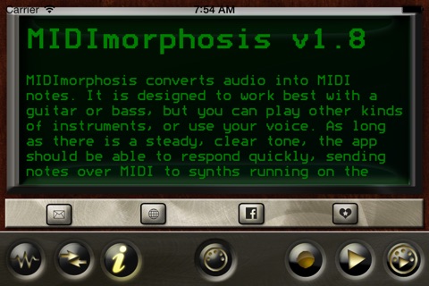 MIDImorphosis captures the pitch of incoming audio, and converts it into MIDI notes that can be used to control iOS synthesizers or external equipment. The app supports both monophonic and polyphonic playing; this version has dramatically improved chord detection.