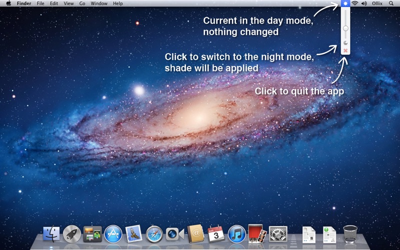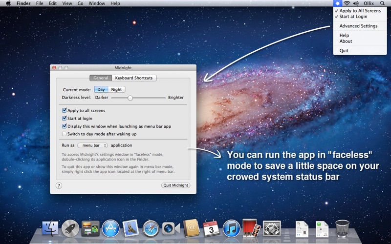 The Midnight icon located at the top right system bar indicates the current mode (sun for the Day Mode and moon for the Night Mode). Click the icon to switch between Day and Night modes or adjust the darkness. Right click the icon to set your preferences. Simple and easy to use.