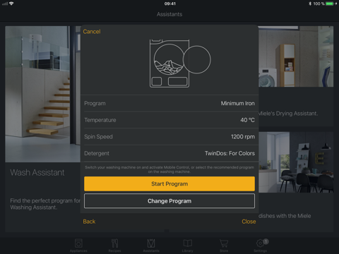 Achieve the best possible cleaning results without being a washing expert? No problem thanks to the Miele app! Let the Washing Assistant in the Miele app guide you to find the perfect programme for your laundry. You can even start the recommended programme directly from the Miele app.