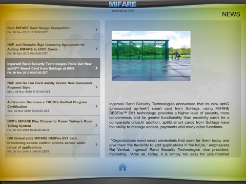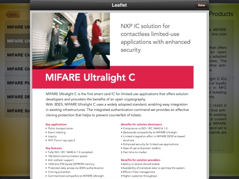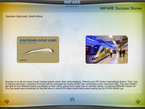 The purpose of the MIFARE iPad/iPhone application is to enable all the members of the value chain to find out latest information regarding MIFARE technology in a very convenient and interactive way. The users are able to discover the overall MIFARE product family and application fields, the multiple contactless smart card projects based on MIFARE technology as well as the latest news generated from www.MIFARE.net.