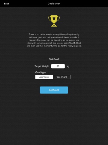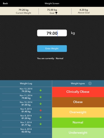 -Weight Tracker: The weight tracker allows you to enter your weight daily. You may also select a weight goal that you would like to reach. The apps keeps a log of all the entered weight values.