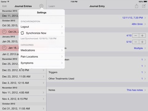Features include built-in graphs and the ability to share your journal entries with others like your doctor. Categories are all customizable and the simple interface makes it easy to enter data. Keep your data in sync across your multiple devices - iPad, iPhone and iPod touch!