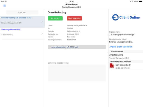 Denk aan belastingaangiften en jaarrekeningen. U kunt daarna aangeven dat ze direct verstuurd moeten naar bijvoorbeeld de Belastingdienst of Kamer van Koophandel. U krijgt een pushnotificatie als er een nieuw document klaarstaat om te accorderen.