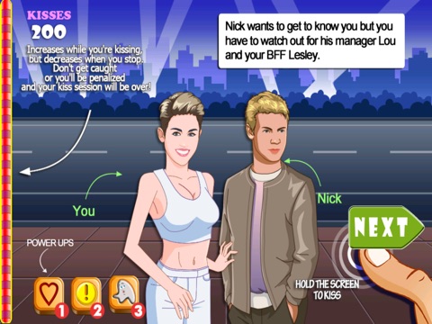 Then all of a sudden… both of you run into each other! But you guys arent alone! Nick and the boys want to get to know you but you guys can’t get caught by Lou or your BFF Lesley. The more you guys kiss, the more interest he has in you and the further along your relationship will grow. Its about finding the right time to make out, how far can you keep it up? Time your kisses perfectly and you guys will live happily ever after!
