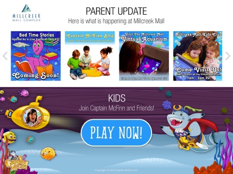 Use on location, the Millcreek Mall Club McFinn app to explore the McFinn & Friends Virtual Aquarium. This stunning interactive experience is set in a beautiful undersea world of entertainment, education and fun created for children ages 4-12. Create your very own, one of a kind swimmer fish avatar choosing from hundreds of fins, eyes, colors, patterns, mouths and more! Name your swimmer fish and "flick" it directly from your mobile device into the gigantic HD virtual aquarium.