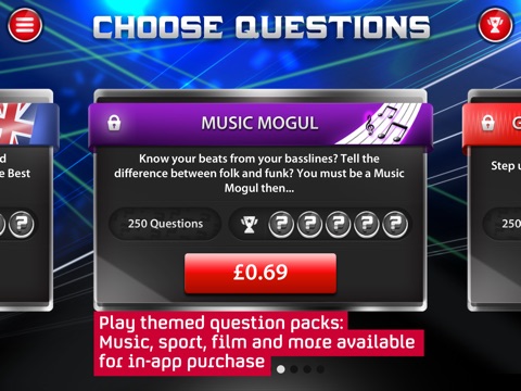 Play through all of the questions from the live shows, or pick your specialist subject from a range of question packs for just 69p each. Specialist packs include sport, music, film and TV.