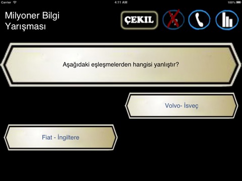 Milyoner bilgi yarışmasıyla bilginizi test edin ! Bu oyun sayesinde olabildiğince çok eğleneceksiniz.