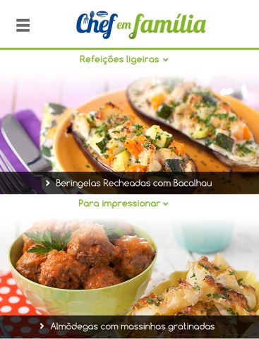 Aqui encontra as receitas divididas por categorias: refeições ligeiras, para crianças, para levar, para impressionar, entradas e sopas, bacalhau e peixe, carne, vegetais, doces e pastelaria.