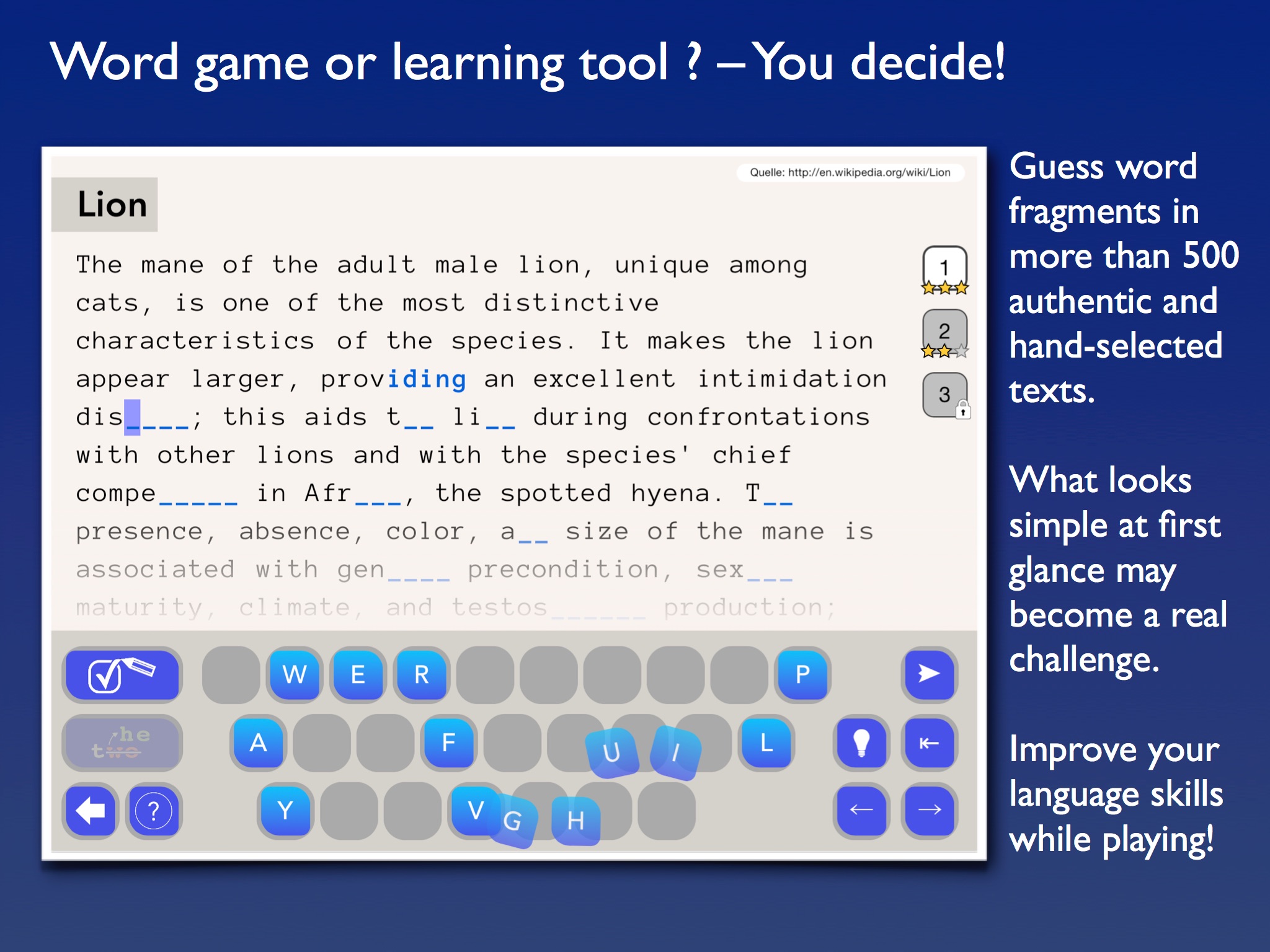 It is at the same time a word game and a learning app with over 500 texts covering interesting facts and trivia from all parts of culture, science and life.