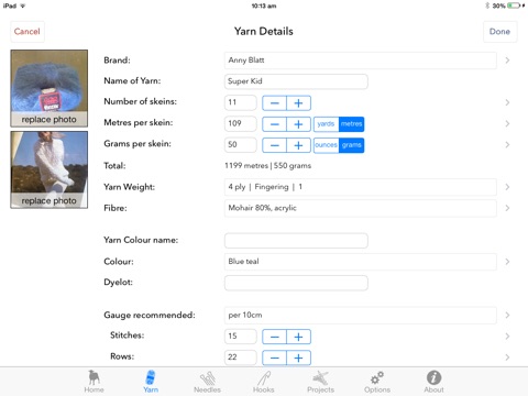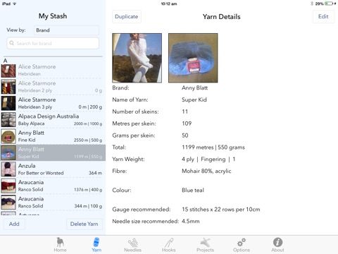 You can add new skeins of yarn, needles and hooks to your stash. You can duplicate existing yarns so that adding a new colour is easy. You can even add 2 photos with each yarn or project.