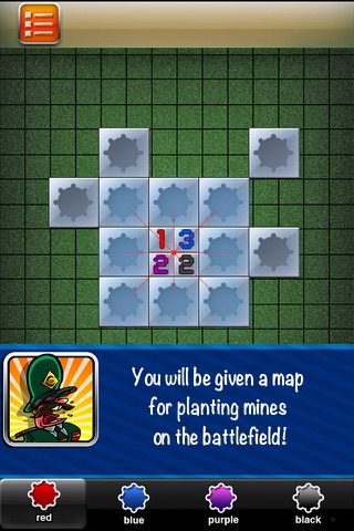 "You need to create a barrier to attack the enemy. Sapper soldier has to plant mines on enemy territory . At the beginning of the game the soldier will be given an encoded map to plant mines . Your task is to decrypt the assignment and plant mines on the enemy territory . If mines are planted incorrectly, your troops will be exploded. On gaininig experience the tasks will be more complicated. The main goal is to fulfill the tasks and be promoted to an officer to go to work at headquarters "