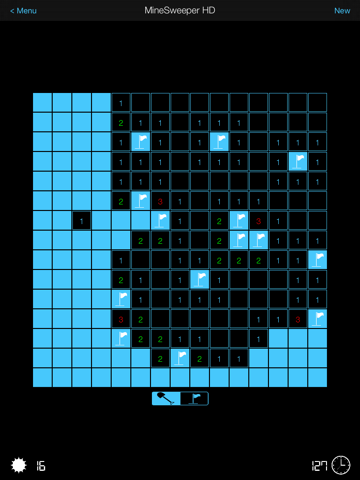 Show/Flag: Tapping the shovel or flag icon at the bottom of the screen will toggle between show and flag mode. In show mode, tapping a cell will reveal it. In flag mode, tapping a cell will place a flag on it, indicating there may be a mine underneath. You dont have to use flags but they make the game easier to solve.