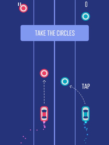 The aim of the game is to get the maximum number of points getting the circles and avoiding the squares while you drive both cars. You can change the side of each car just typing the screen.