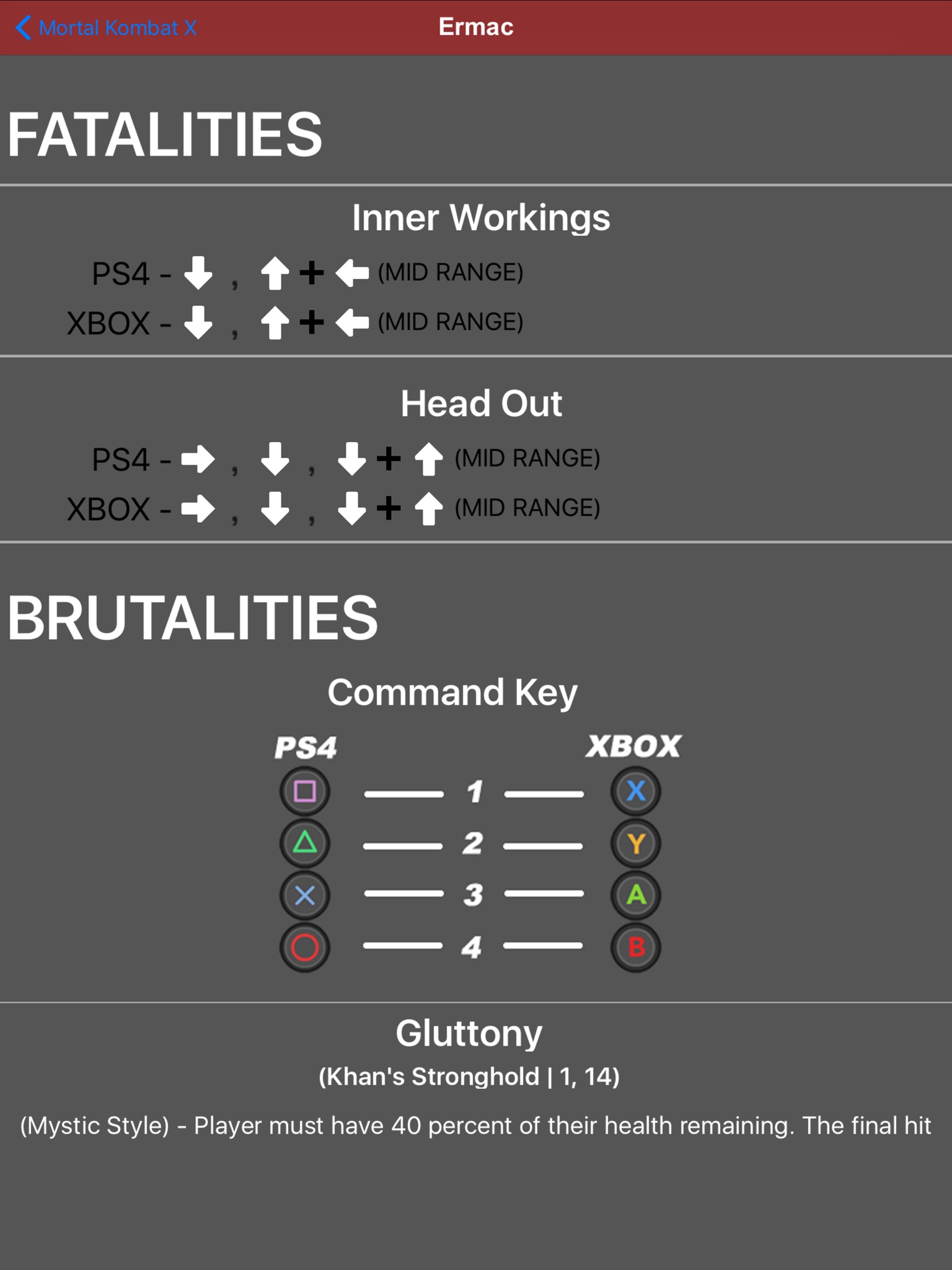 No need to pause the game to find out the Fatalities and the Brutalities of each character. This app will help players, play the game and have that move set side by side with them. Mini Guide that included all DLC players so far.