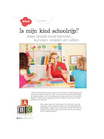 Mini is een glossy en onafhankelijk magazine over kinderwens, zwangerschap, bevalling, babys, peuters, kleuters en opvoeding voor bijna- en toekomstige ouders. Mini vergezelt immers jonge ouders in de realisatie van hun kinderwens, tijdens de zwangerschap, de bevalling en bij alles wat zich afspeelt in hun leven met jonge kinderen. Het gaat om meer dan het kind alleen, want ook broers en zussen, oma’s en opa’s draaien mee in de drukke maar boeiende wereld van jonge ouders en samengestelde gezinnen. Mini combineert essentiële informatie, nuttige tips en sterke emoties via vaste rubrieken en seizoensgebonden themadossiers.