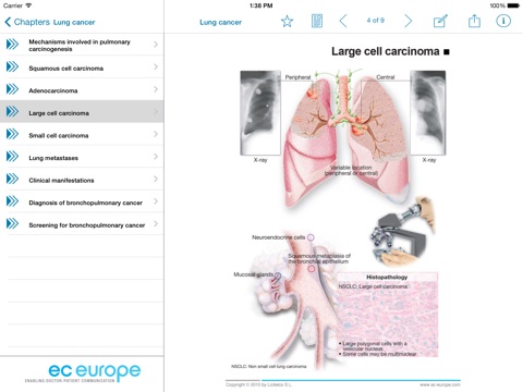 We would like to present you with a tool which provides you a new and complete way to develop a good communication workflow with your patient. It will be always at hand in your iPhone or iPad for those moments when you need to talk about and discuss lung cancer with your patient. With the help of this application you can explore a large collection of high quality, simple yet rigorous medical illustrations about all the relevant aspects of the disease (from its anatomical basis to its manifestations, staging, management and treatment options). Using these images to explain to your patient everything he needs and wants to know, you will get him more involved to take an active role in his own care. The Miniatlas Lung Cancer is the perfect tool to encourage him to talk about any concerns or doubts he might have. This is the best way to give him the best personal care possible and will also help you manage his case more efficiently.