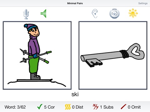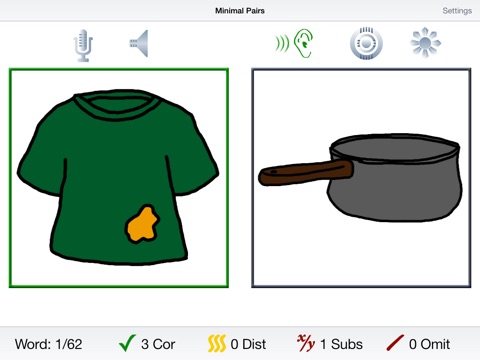 Minimal Pairs is an auditory discrimination activity that helps children discriminate between words that differ in pronunciation by one sound. They learn to hear the difference between words like “stop - top” and “rake - wake”. They are prompted to “Show Me” the target word by tapping on the colorful pictures and listening for the sounds in the target word and a foil.