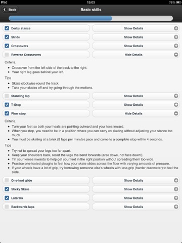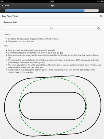 Great app for keeping track of the skills you know and the ones you need to work on. All basic skills are outlined with tips on how to do each of them. One thing that would make this better would be if there was another option for keeping track of laps. In our league, we track how long it takes to do the 27 laps, not how many we do in 5 minutes. Having an option to record time for 27 laps would be awesome!!