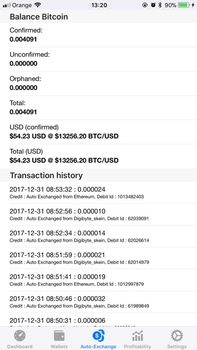 - Detailed stats for selected auto-exchange currency ( confirmed, total, USD Value)
