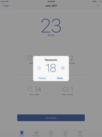 * Manually update your total number of Placements, Video Showings, Return Visits or Bible Studies quickly and easily.
