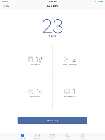 * Within each report, you can enter and view activity for that month including Hours (field service or credit), Visits, Placements and Video Showings. Any visits added through the Calls section will also be displayed for you to review.