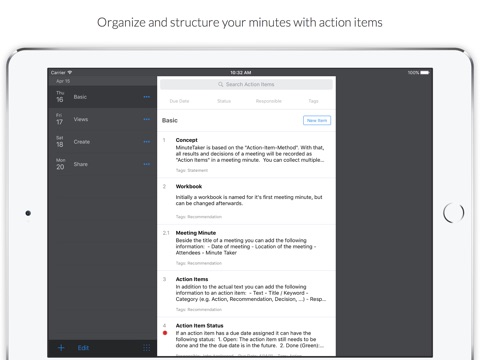 MinuteTaker is based on the Action Item Format. Every decision, statement, or recommendation is described as a short and concise point that keeps your protocols short