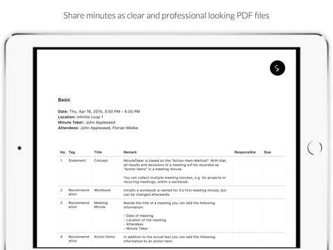 Create structured meeting minutes, summaries, and notes. Share them as clean and professional looking PDF-file with all attendees.