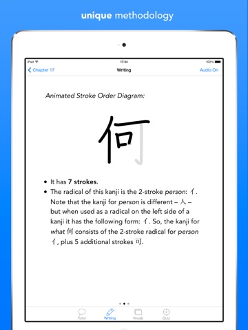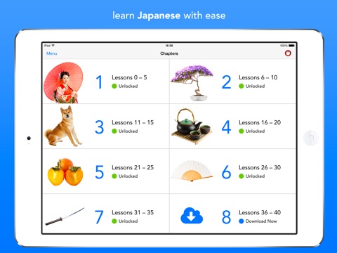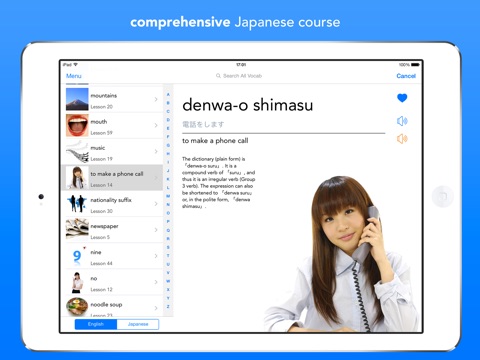 Unlike most other Japanese language apps which just have lists of vocabulary or flashcards, this app actually teaches you the basics of Japanese — grammar, pronunciation, the writing system, and the usage of words — using an effective and clear methodology which you will thoroughly enjoy! There is simply no better way of learning Japanese!